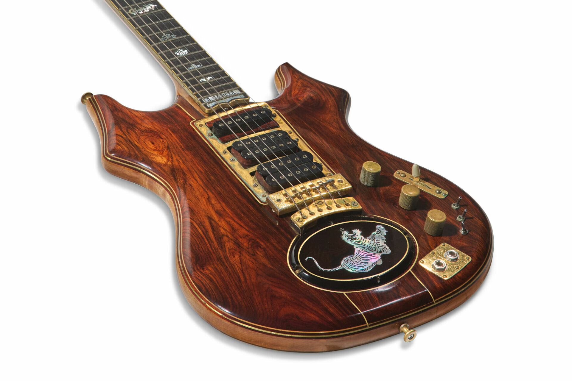 傑瑞・賈西亞(Jerry Garcia)的吉他「Tiger 老虎」-由制琴師道格·歐文訂製。這把吉他是加西亞1979年至1989年間的主要舞台用琴,尤其值得一提的是,它曾用於 1995 年 7 月 9 日在芝加哥士兵球場舉行的與感恩而死樂隊的最後一場演出(估價:100 萬至 200 萬美元)