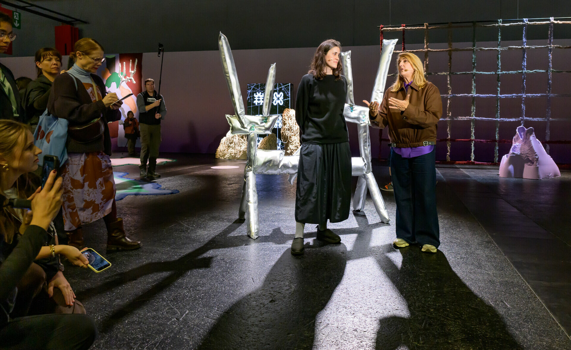 展覽開幕當天,西班牙知名設計師兼建築師派翠西亞.奧奇歐拉(Patricia Urquiola)展示了她的全新設計裝置作品「among-all」。她與《Wallpaper》雜誌全球設計總監羅莎.貝托利 (Rosa Bertoli) 展開對話,闡述了哪些材料、設計和技術正在塑造室內設計的未來。「among-all」是一場關於「共在」的空間實驗,也是一個暫時生成的生態系。她不再將展覽視為被動承載作品的容器,而是將整個場域視為一個會回應、會變化、會學習的存在。觀者進入其中,不再只是觀看者,而是被系統感知、被空間辨識,甚至以自身的行走、停留與互動,成為影響整體氛圍的一部分。