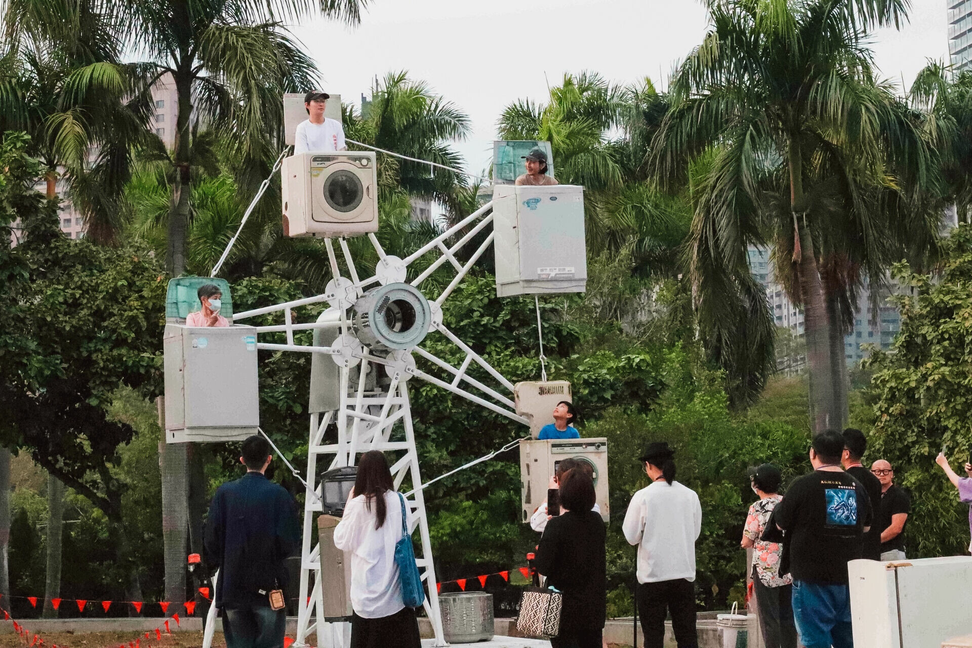 廖建忠〈運轉生活的終點站 4.0 L-oops〉將廢棄家電轉化為具象徵性的機械結構,映照出人們對效率、循環、消費的集體依賴