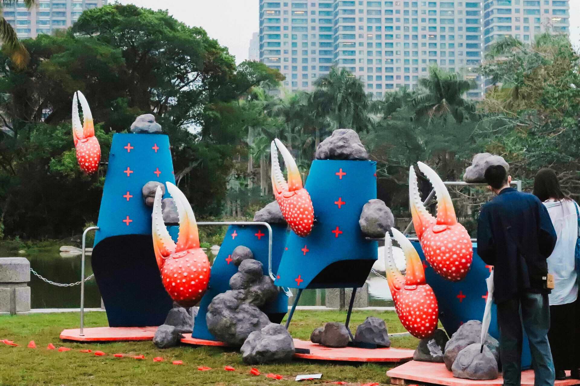 另一方面,當展覽進一步深入園區腹地,作品開始與生態產生更直接的對話。巨大的蟹螯隨著音樂律動,在湖畔搖擺,情歌成為跨物種溝通的媒介;微小的水熊蟲被放大為柔軟而可親近的形體,邀請人們以觸覺想像另一種生命尺度。部分作品讓觀眾重新排列鳥禽與植物的影像模組,模擬人類對自然的干預與重組;也有創作在精準刻度與模糊輪廓之間徘徊,質疑測量與控制是否真能定義世界。這些作品並不試圖給出明確答案,而是引導人們暫時放下以人為中心的視角,嘗試在自然的節奏中重新校準自身的位置。