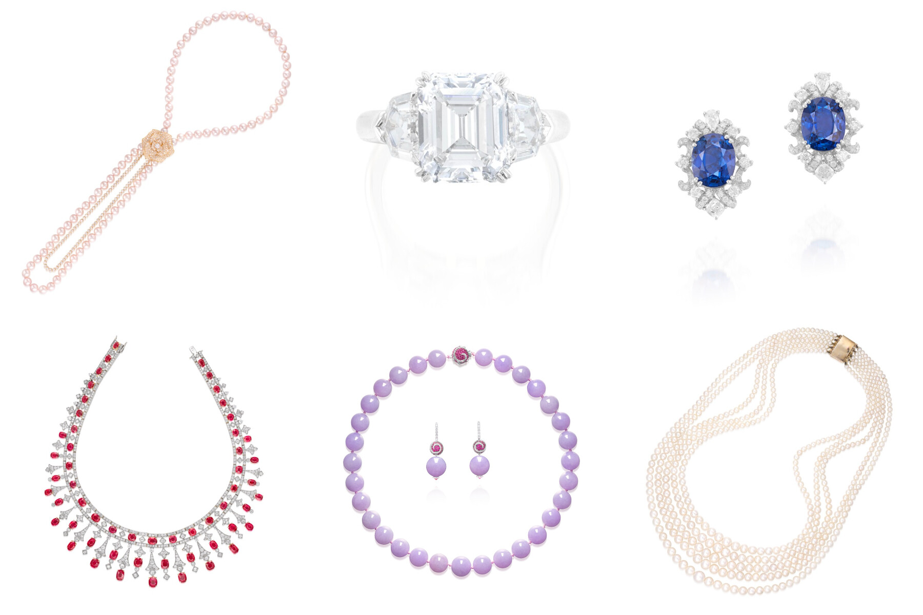 伯爵「Limelight Mediterranean Garden」養殖珍珠及鑽石項鏈(左上至右下)、海瑞溫斯頓 5.10 克拉 D/VS1 鑽石戒指、7.79 及 7.65 克拉「緬甸」天然藍寶石配鑽石耳環一對、「緬甸」天然紅寶石配鑽石項鏈、天然紫色翡翠配紅寶石及鑽石項鏈及耳墜套裝、天然珍珠項鏈