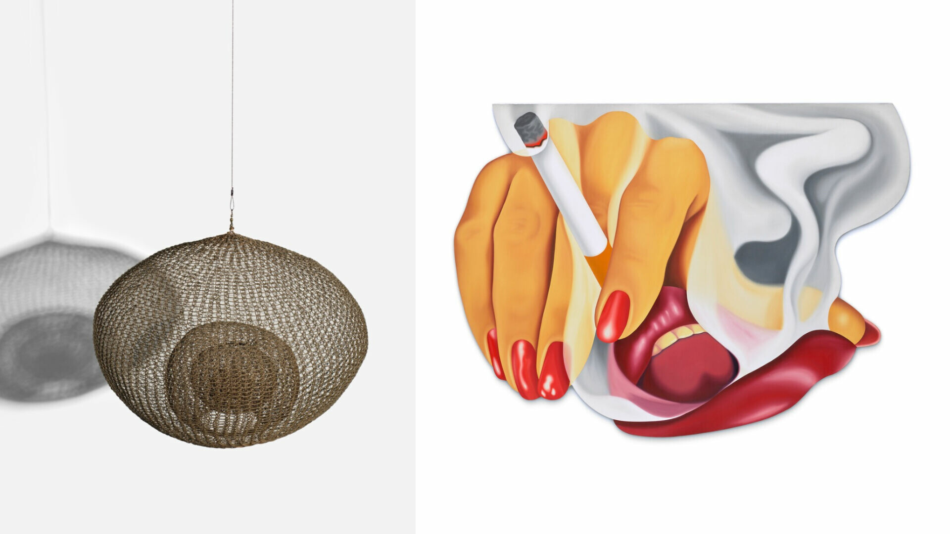 魯斯·阿薩瓦《無題 S.013(懸吊單瓣,五層連續嵌套形體)》,1987年作,懸吊雕塑 氧化銅線編織,20 x 29 x 29 公分,估價:2,200,000 - 4,200,000港元(圖左);湯姆·衛索曼《吸煙者#17》,1975年作,油彩 成形畫布243.8 x 332.7公分,估價:20,000,000 – 30,000,000港元(圖右)