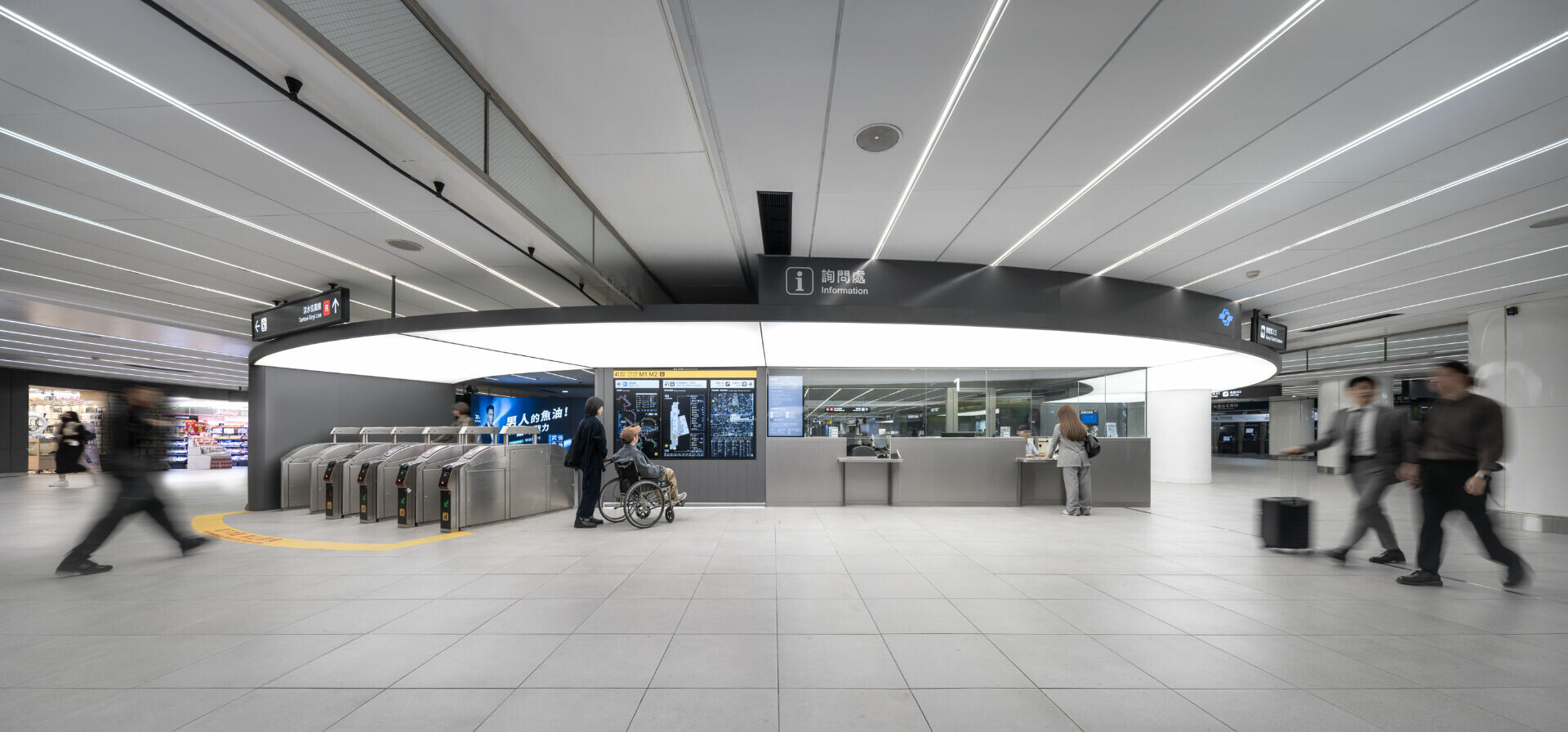 此外,對一座高運量車站而言,效率是一種公共善。此次改造並非僅止於視覺更新,而是深入檢視人流數據,重新調整動線的邏輯。西側轉乘區的進出閘門被重新配置,讓龐大的轉乘人潮得以更快消化;東側則將閘門後移,串聯周邊商業,形塑出連續而完整的地下廊道。這樣的調整,並不張揚,卻極其關鍵。當動線變得順暢,焦躁自然下降;當路徑清楚,旅客不再需要頻繁停下確認方向,整體空間的節奏也隨之放慢,卻更有效率。