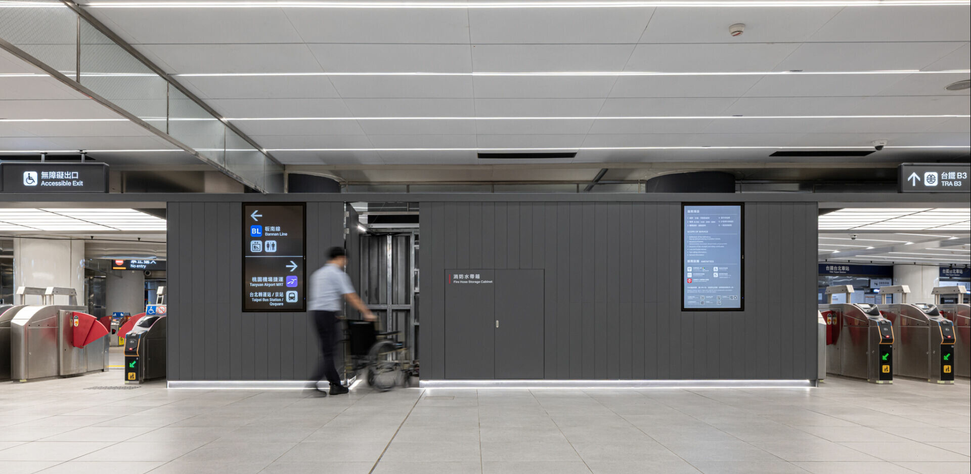 另一方面,在人流最密集的 B3 層,指標的重要性被重新定義。設計團隊依據實際流量,刻意引導非轉乘旅客分流,讓空間壓力得以被重新分配。箭頭的方向、位置與高度皆經過細緻調整,使尋路成為一件直覺而不費力的事。同步導入的,是台北捷運於 2023 年更新的指標準則,以及通用設計字體。這不僅是視覺風格的更新,更是一種價值選擇——讓不同年齡、不同能力的使用者,都能在同一空間中被平等對待。