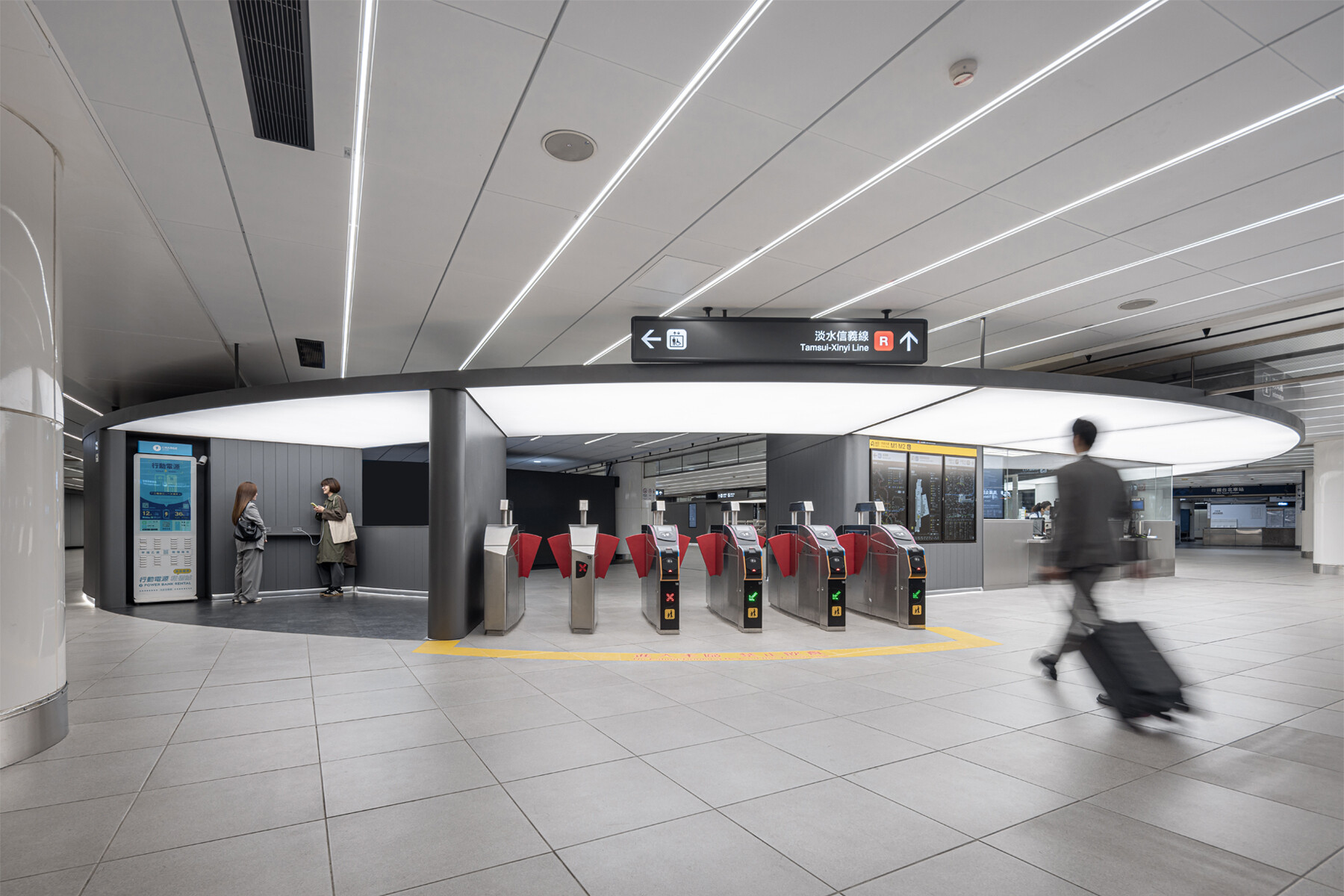 首先,延續「捷運中山站再設計」的核心精神,設計團隊再次以「服務盒」作為回應複雜需求的空間語彙。然而,台北車站的條件更為嚴苛,也更為真實。圓弧,於是成為關鍵。這些圓弧形的服務盒不只是造型選擇,而是一種對既有結構的溫和回應。它們包覆部分圓柱,柔化原本銳利而壓迫的邊界,讓空間不再以阻擋為主體,而是轉向引導。服務被整合進這些發光的盒體之中,詢問、儲藏、商業、會面、充電、垃圾收納與數位指標不再彼此競逐,而是在同一個清楚可辨的系統裡各就其位。在這裡,光不只是照明,而是一種宣告:有光的地方,就有服務。當功能被收納、界面被統一,空間開始恢復自我說明的能力。