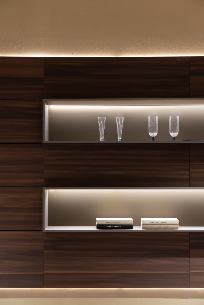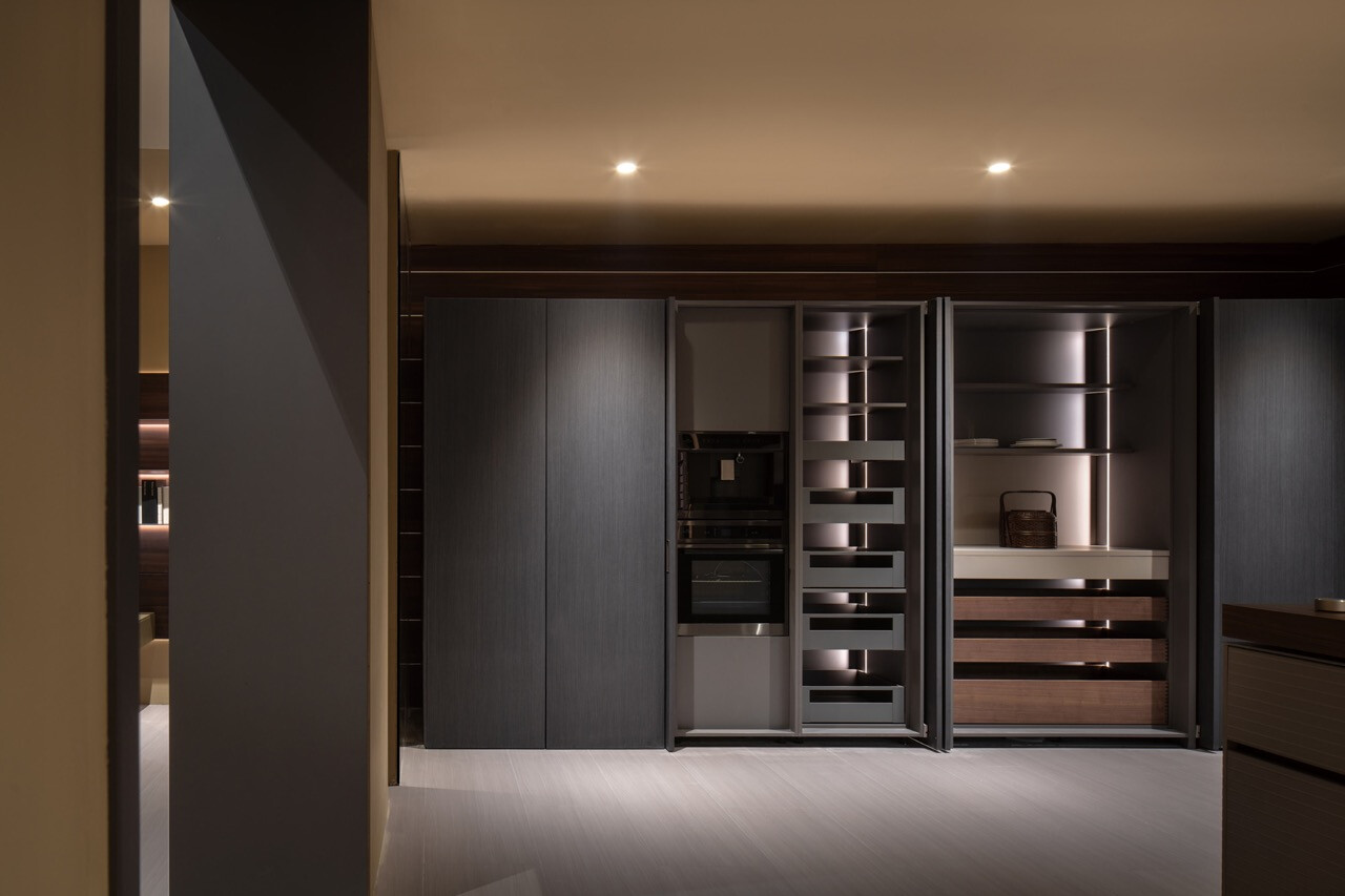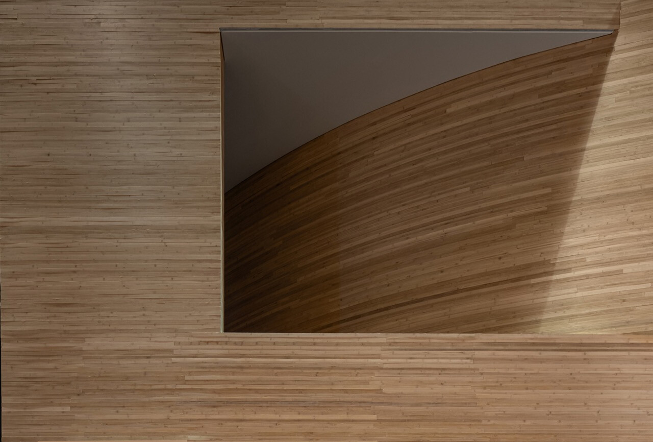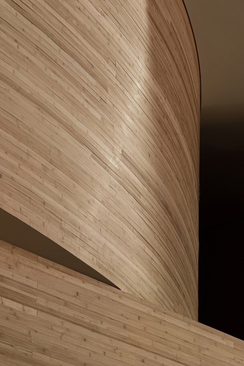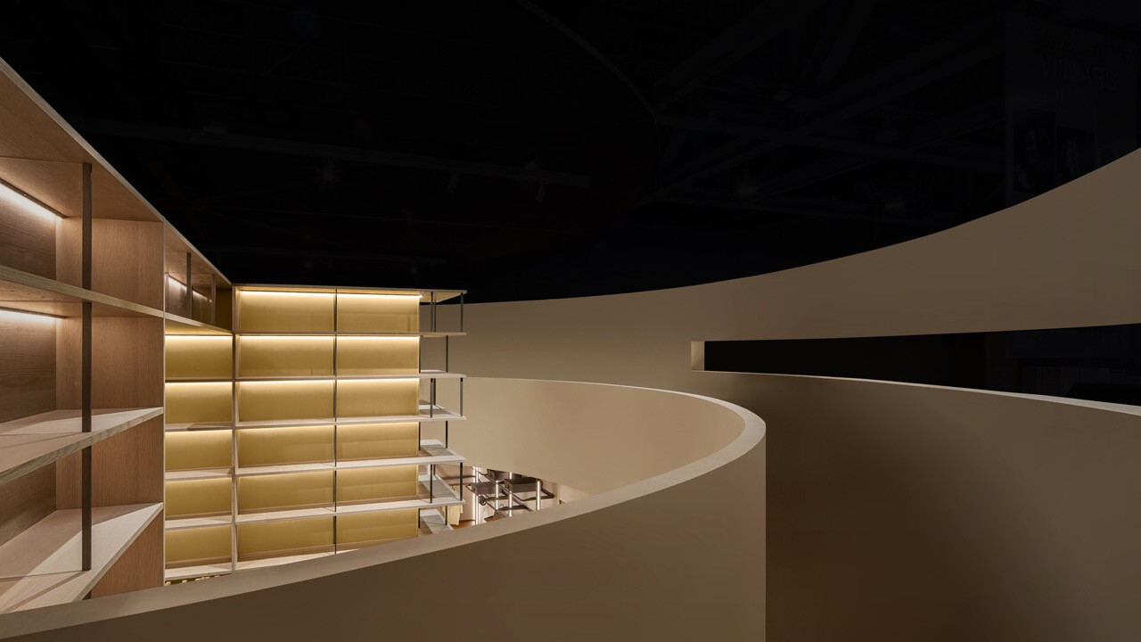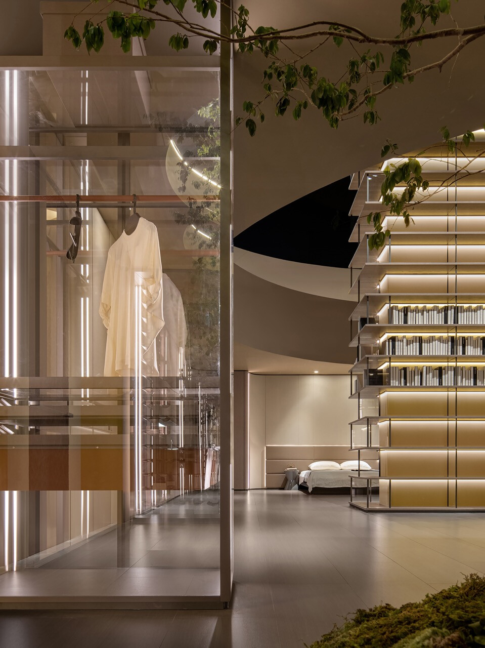 再者,建築的外部,是人與空間建立第一層關係的地方。RARA 展廳外立面以竹片水平排列,線條節奏克制而流暢,為整體建築覆上一層溫潤而內斂的表情。這種極簡並非冷淡,而是一種刻意保留的留白,使人產生窺探的慾望。透過立面縫隙,一株向上生長的樹木映入眼簾,成為空間的精神核心。自然並非裝飾,而是被納入建築敘事之中,提醒人們所有設計最終仍回應生命本身。進入室內,光影與場景隨著步伐展開。櫥櫃、衣櫃、博古櫃、隱形門與牆板展示,不再只是產品陳列,而是與空間結構彼此咬合。通天書櫃作為隔而不斷的介面,在藏與露之間創造多層次的視覺深度,並與弧形結構交錯出豐富的線條對話。