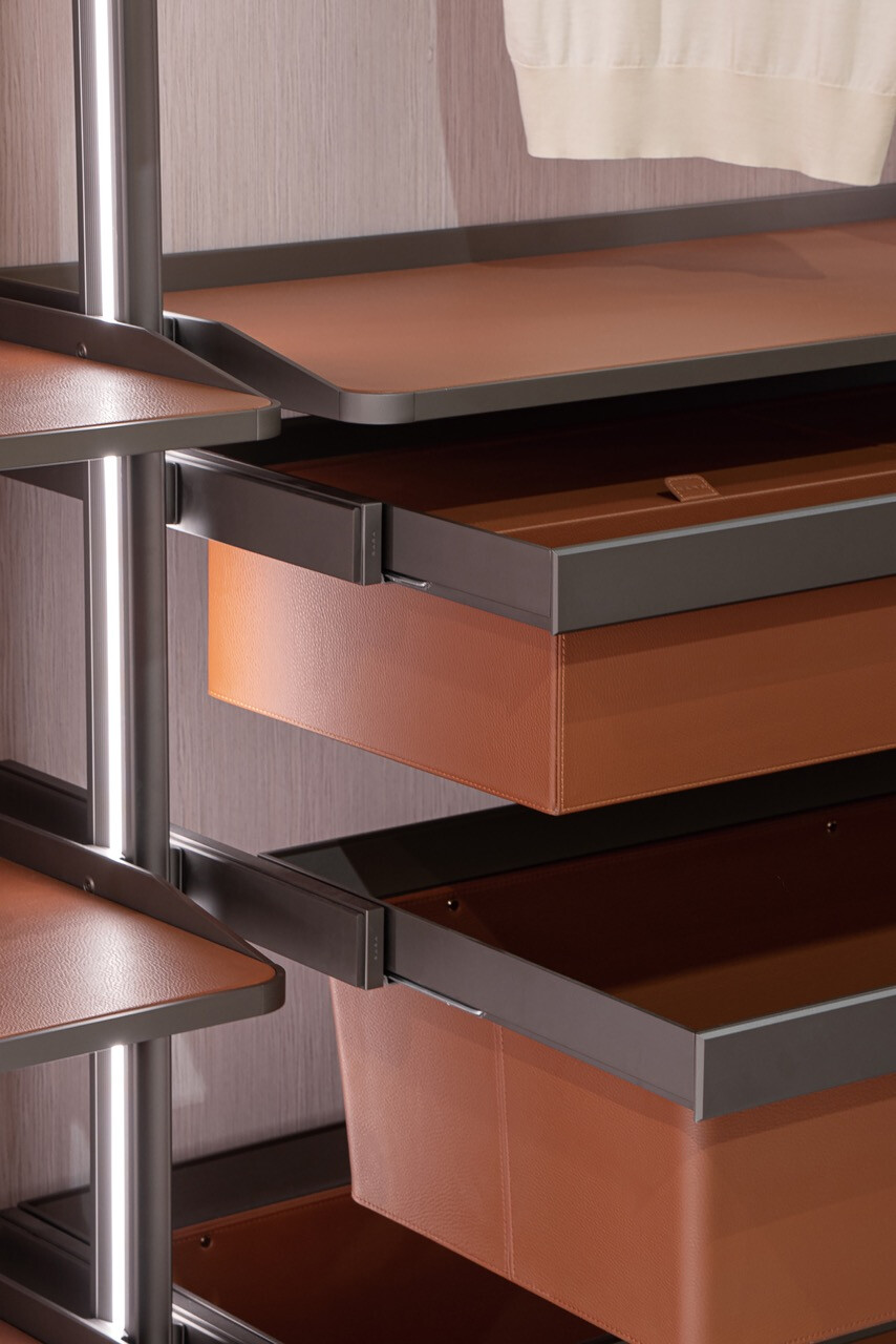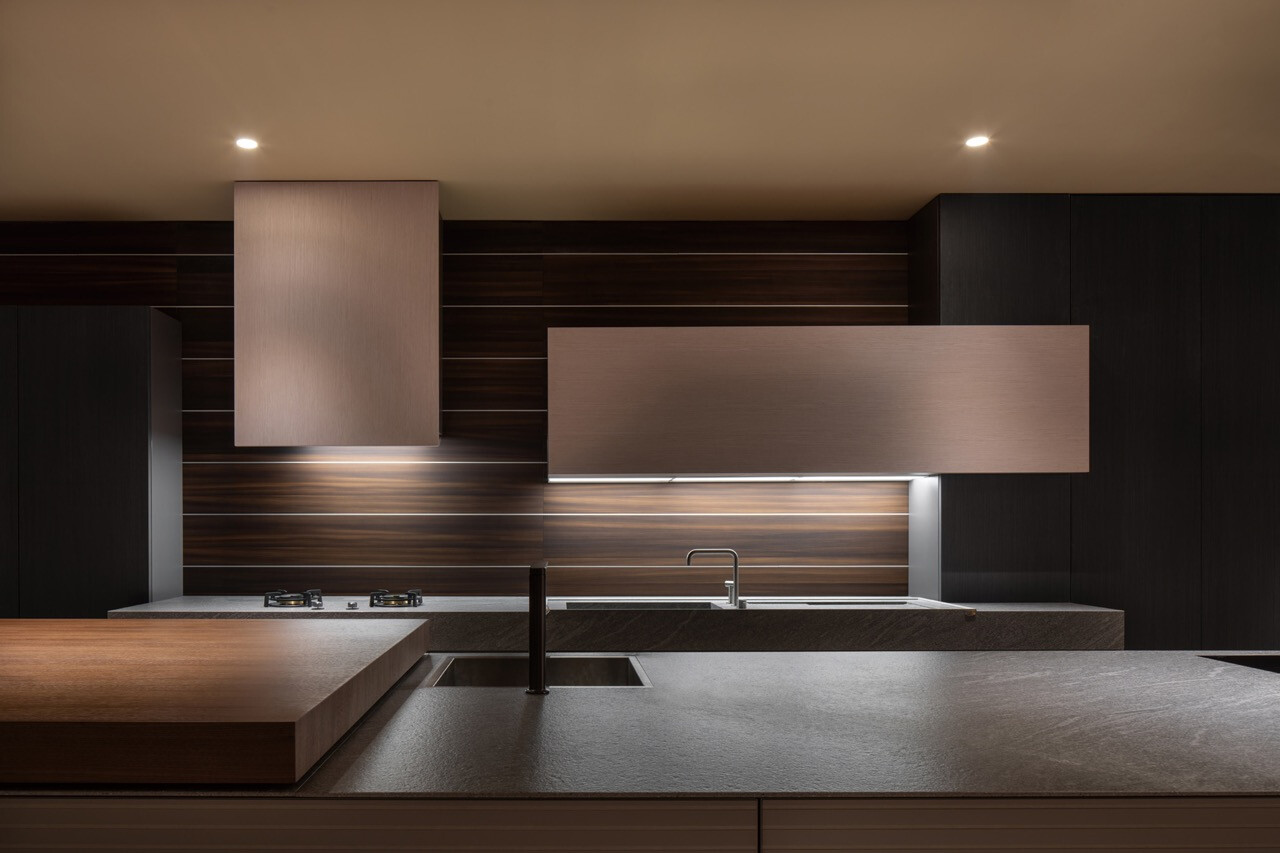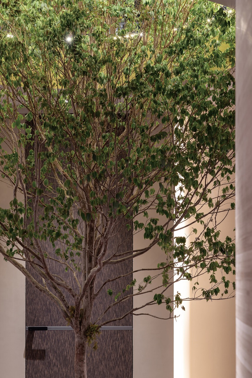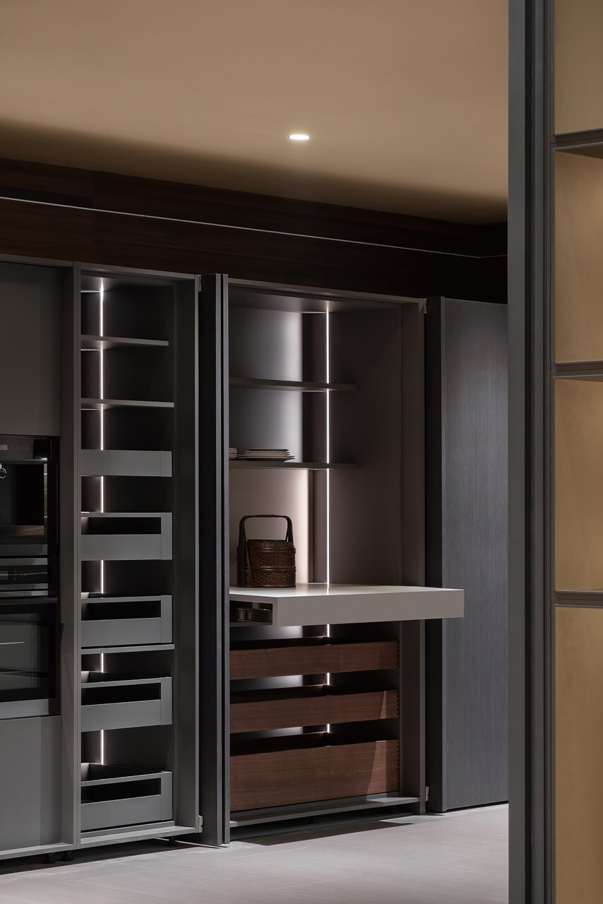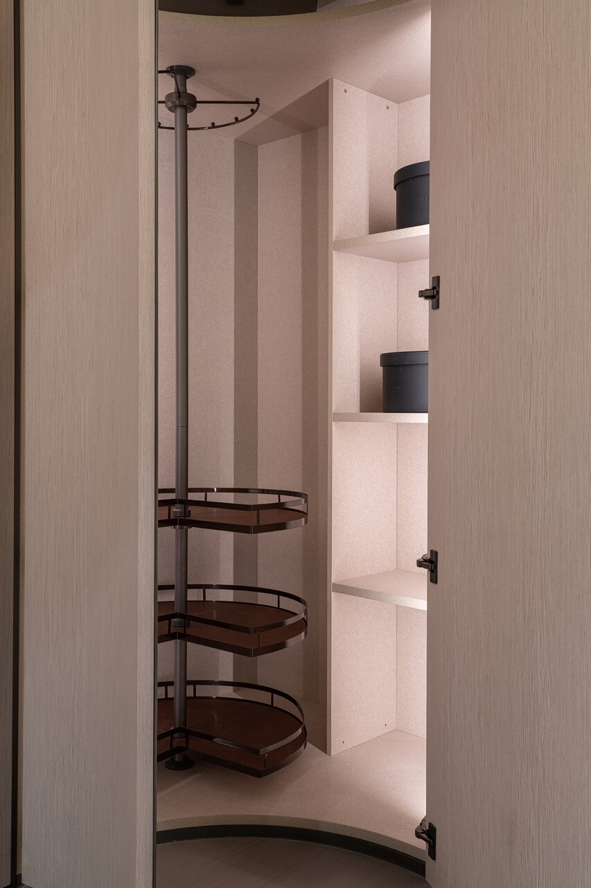 再者,建築的外部,是人與空間建立第一層關係的地方。RARA 展廳外立面以竹片水平排列,線條節奏克制而流暢,為整體建築覆上一層溫潤而內斂的表情。這種極簡並非冷淡,而是一種刻意保留的留白,使人產生窺探的慾望。透過立面縫隙,一株向上生長的樹木映入眼簾,成為空間的精神核心。自然並非裝飾,而是被納入建築敘事之中,提醒人們所有設計最終仍回應生命本身。進入室內,光影與場景隨著步伐展開。櫥櫃、衣櫃、博古櫃、隱形門與牆板展示,不再只是產品陳列,而是與空間結構彼此咬合。通天書櫃作為隔而不斷的介面,在藏與露之間創造多層次的視覺深度,並與弧形結構交錯出豐富的線條對話。