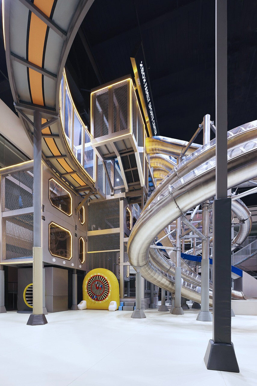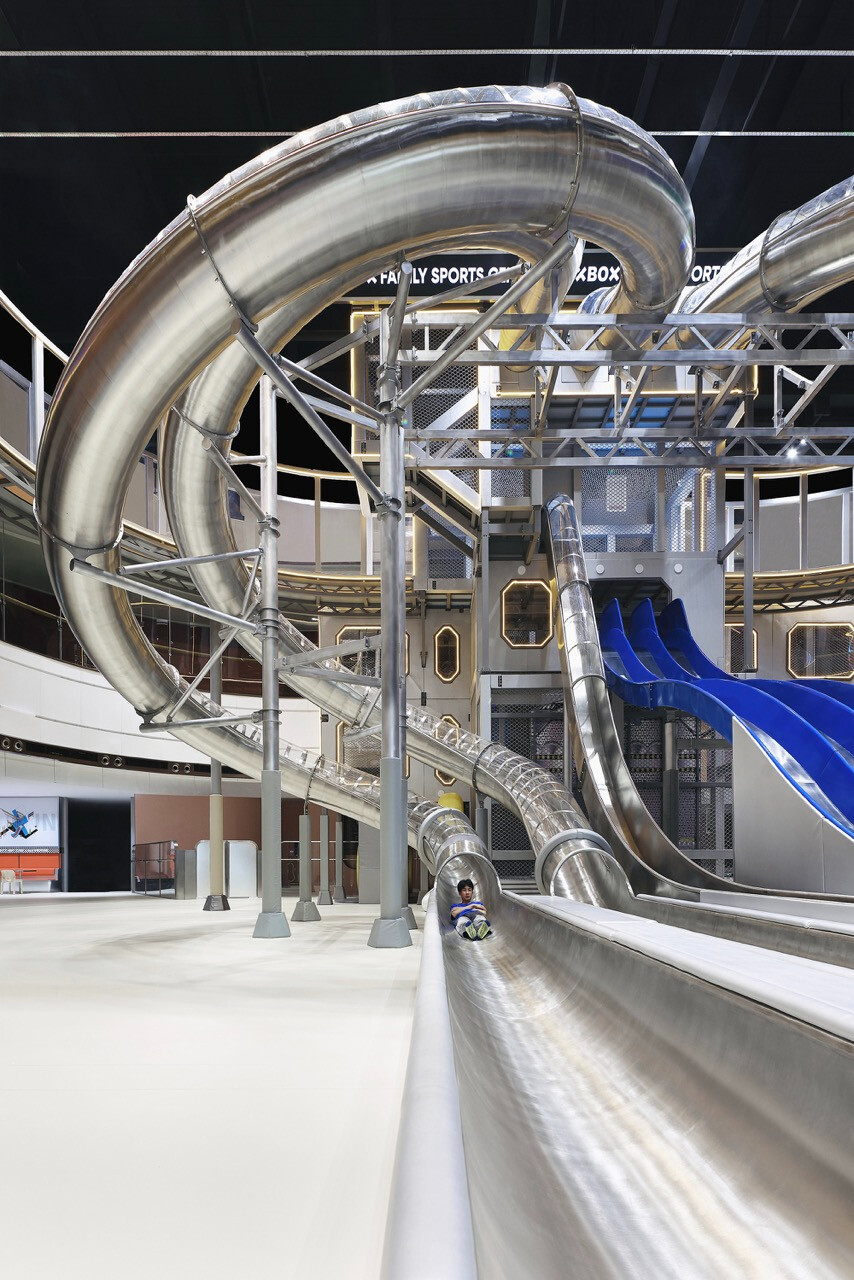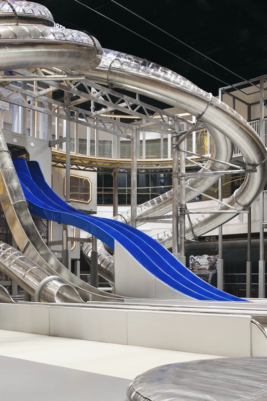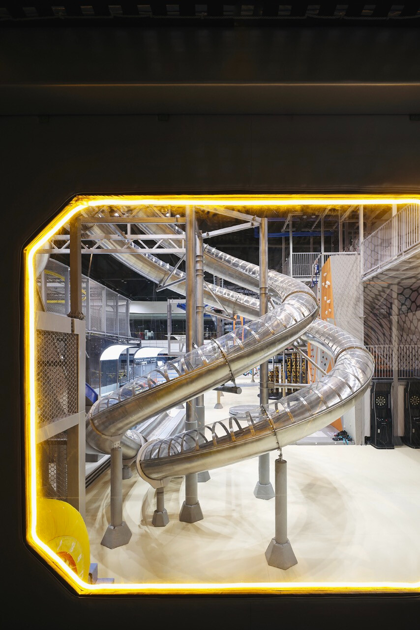 首先,入口處半圓形的接待櫃檯與銀色充氣裝置,成為第一個引導視線的節點。換鞋區的存在不只是機能考量,更是一種心理轉換的儀式,提醒身體即將從日常狀態,切換為運動與遊戲的模式。穿越閘門後,挑高而開闊的主場域瞬間展開,空間尺度的轉變,讓人彷彿被拋入另一個平行世界。銀色作為主調,搭配藍與橙的點綴,整體色彩語言明確致敬 Space Age 的未來想像。不鏽鋼滑梯與透明高空隧道盤旋於場域核心,如同工業管線般赤裸而直接,鋼構、五金與結構不再被隱藏,而是成為視覺的一部分,誠實地展現力量、速度與科技感。
