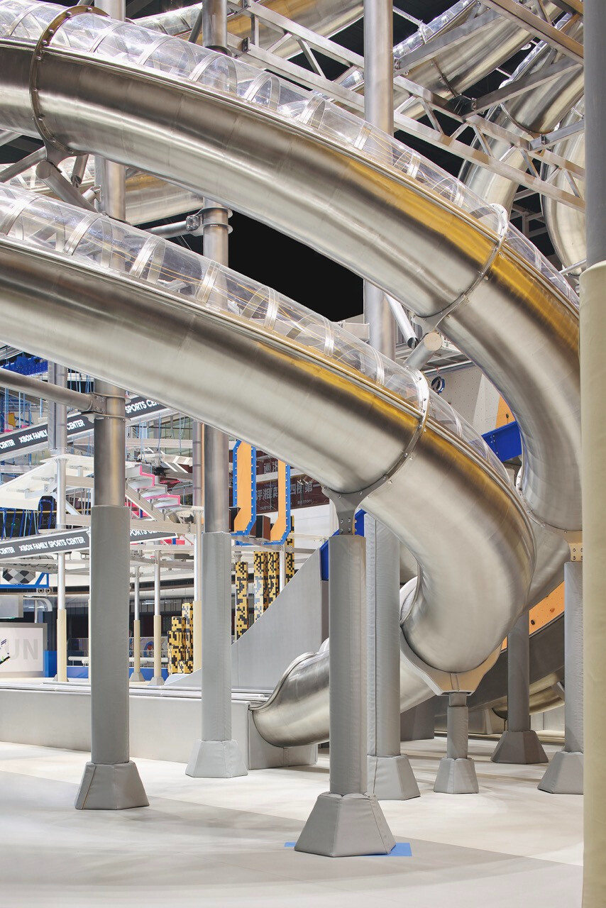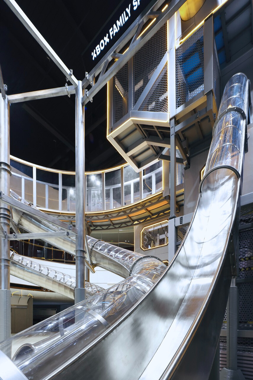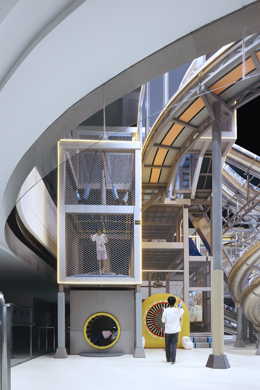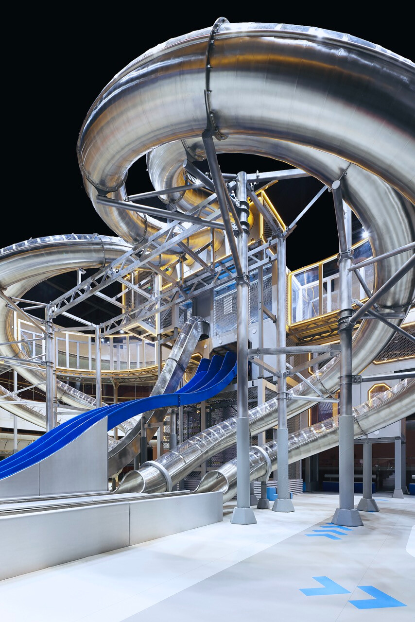 首先,入口處半圓形的接待櫃檯與銀色充氣裝置,成為第一個引導視線的節點。換鞋區的存在不只是機能考量,更是一種心理轉換的儀式,提醒身體即將從日常狀態,切換為運動與遊戲的模式。穿越閘門後,挑高而開闊的主場域瞬間展開,空間尺度的轉變,讓人彷彿被拋入另一個平行世界。銀色作為主調,搭配藍與橙的點綴,整體色彩語言明確致敬 Space Age 的未來想像。不鏽鋼滑梯與透明高空隧道盤旋於場域核心,如同工業管線般赤裸而直接,鋼構、五金與結構不再被隱藏,而是成為視覺的一部分,誠實地展現力量、速度與科技感。