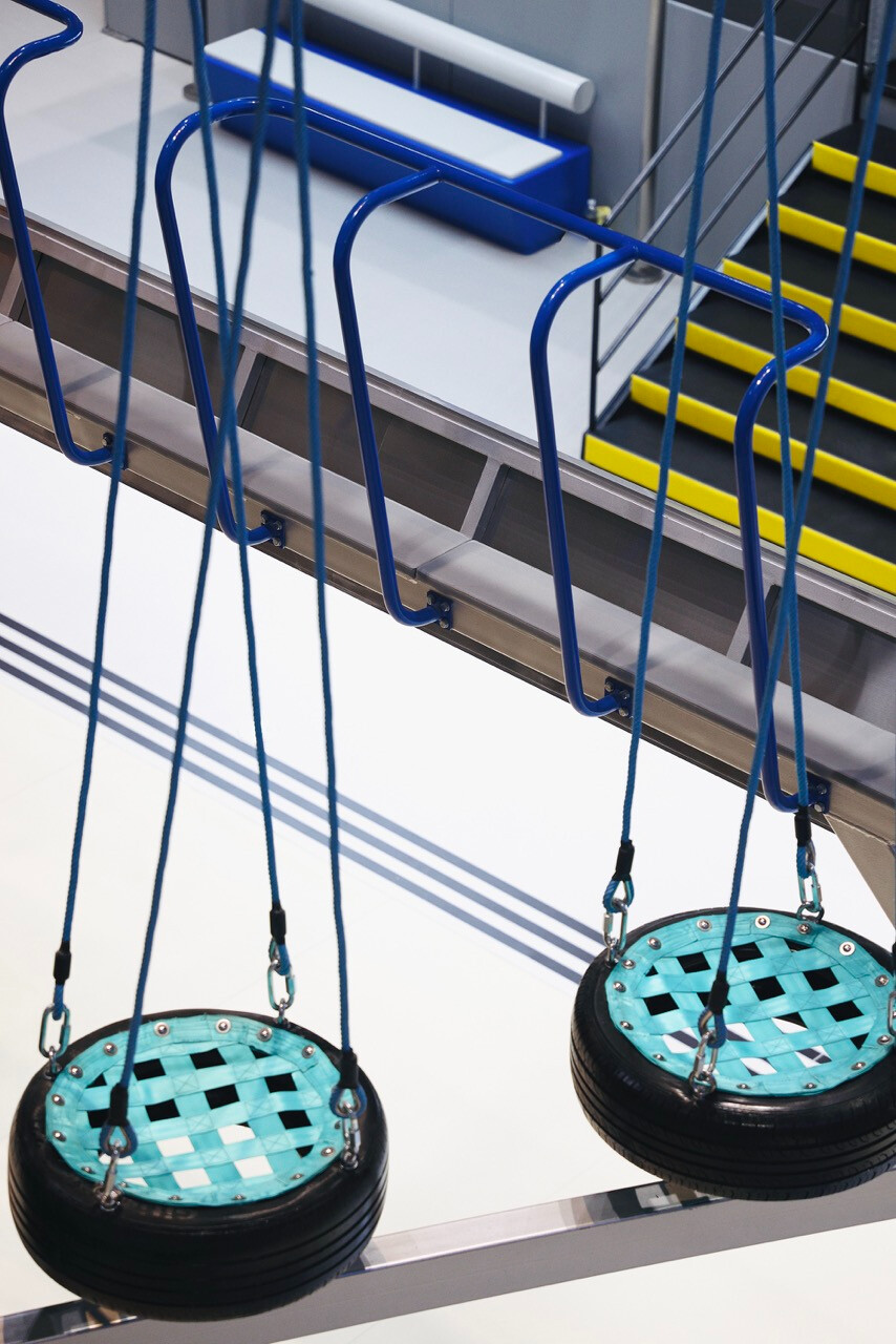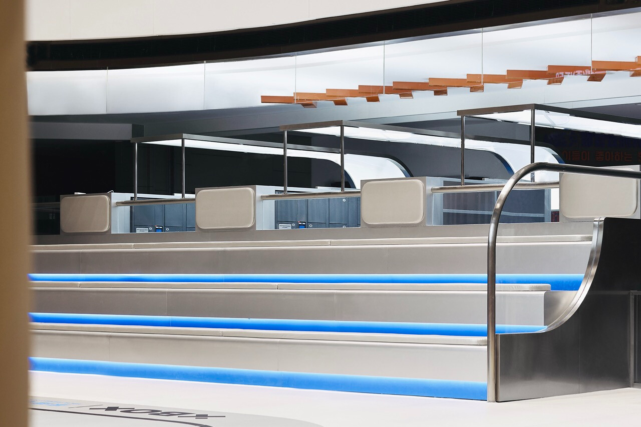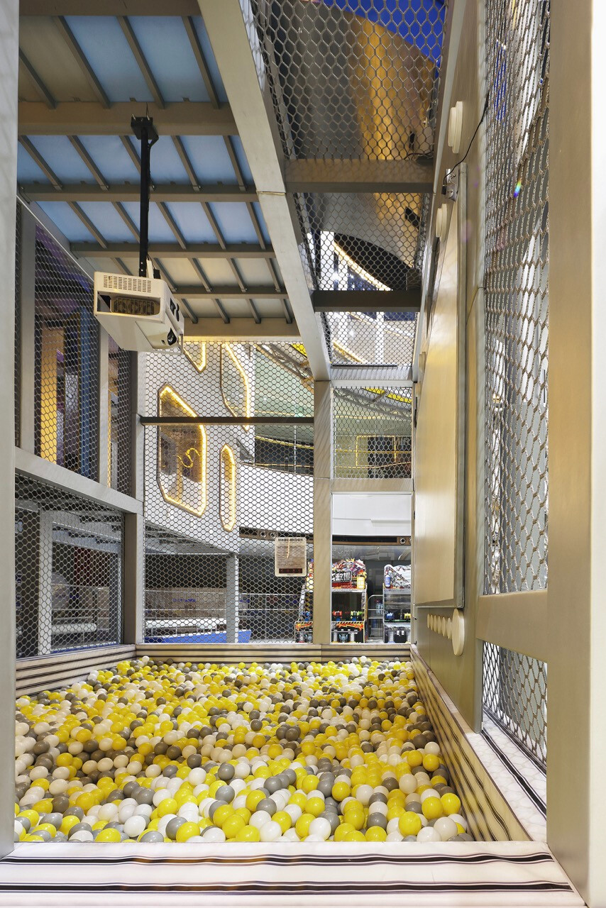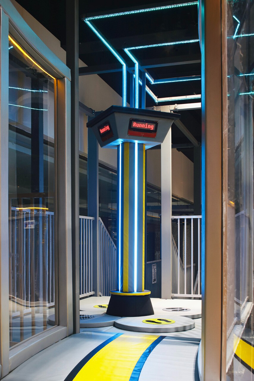 首先,入口處半圓形的接待櫃檯與銀色充氣裝置,成為第一個引導視線的節點。換鞋區的存在不只是機能考量,更是一種心理轉換的儀式,提醒身體即將從日常狀態,切換為運動與遊戲的模式。穿越閘門後,挑高而開闊的主場域瞬間展開,空間尺度的轉變,讓人彷彿被拋入另一個平行世界。銀色作為主調,搭配藍與橙的點綴,整體色彩語言明確致敬 Space Age 的未來想像。不鏽鋼滑梯與透明高空隧道盤旋於場域核心,如同工業管線般赤裸而直接,鋼構、五金與結構不再被隱藏,而是成為視覺的一部分,誠實地展現力量、速度與科技感。
