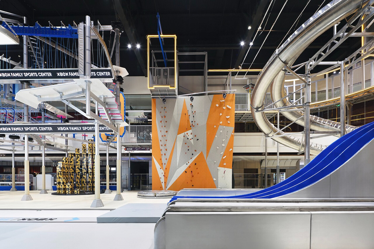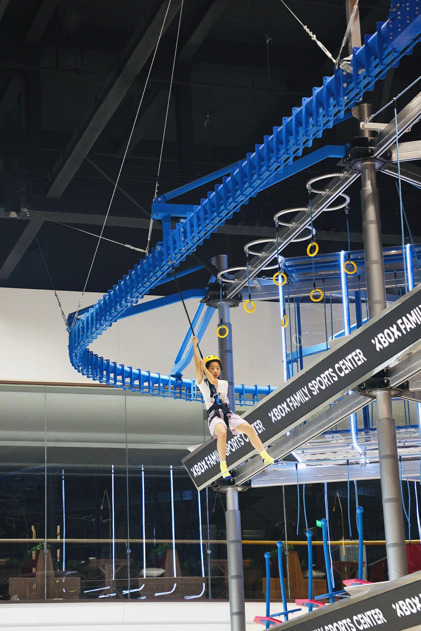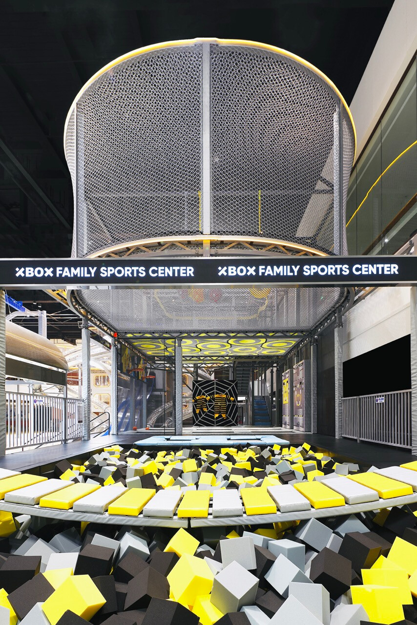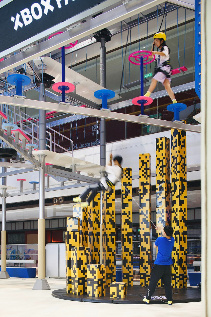 然而,對 Z 世代而言,價值不再只來自於擁有,而是來自於參與。XBOX 家庭運動中心正是基於這樣的世代洞察,將近三十項體驗型設施編織成一條連續的冒險路徑,讓刺激、探索與成就感層層堆疊。高達十一公尺的滑梯系統,以速度作為情緒的引爆點;而超過二十公尺的透明高空隧道,則讓身體懸浮於空中,視線俯瞰整個場域,形成立體而強烈的空間感知。這些設施不只是娛樂工具,更是空間節奏的轉折節點。高空拓展區以多重關卡構成,平衡、判斷、力量與耐力在不同關卡中被輪番測試。這種循序推進的設計,使參與者在無形中進入一種專注狀態,彷彿身處一場現實版的冒險遊戲。而披上像素語彙的梅花樁,則巧妙地喚醒集體記憶,讓童年遊戲的純粹快樂,在當代空間中重新被召喚。這種跨世代的情感連結,使場域不再只屬於某一個年齡層。