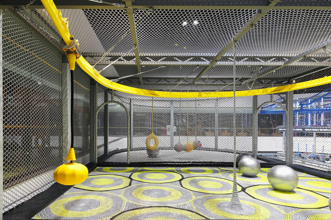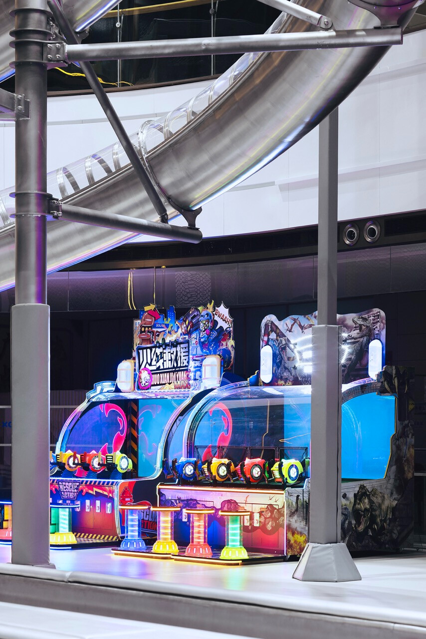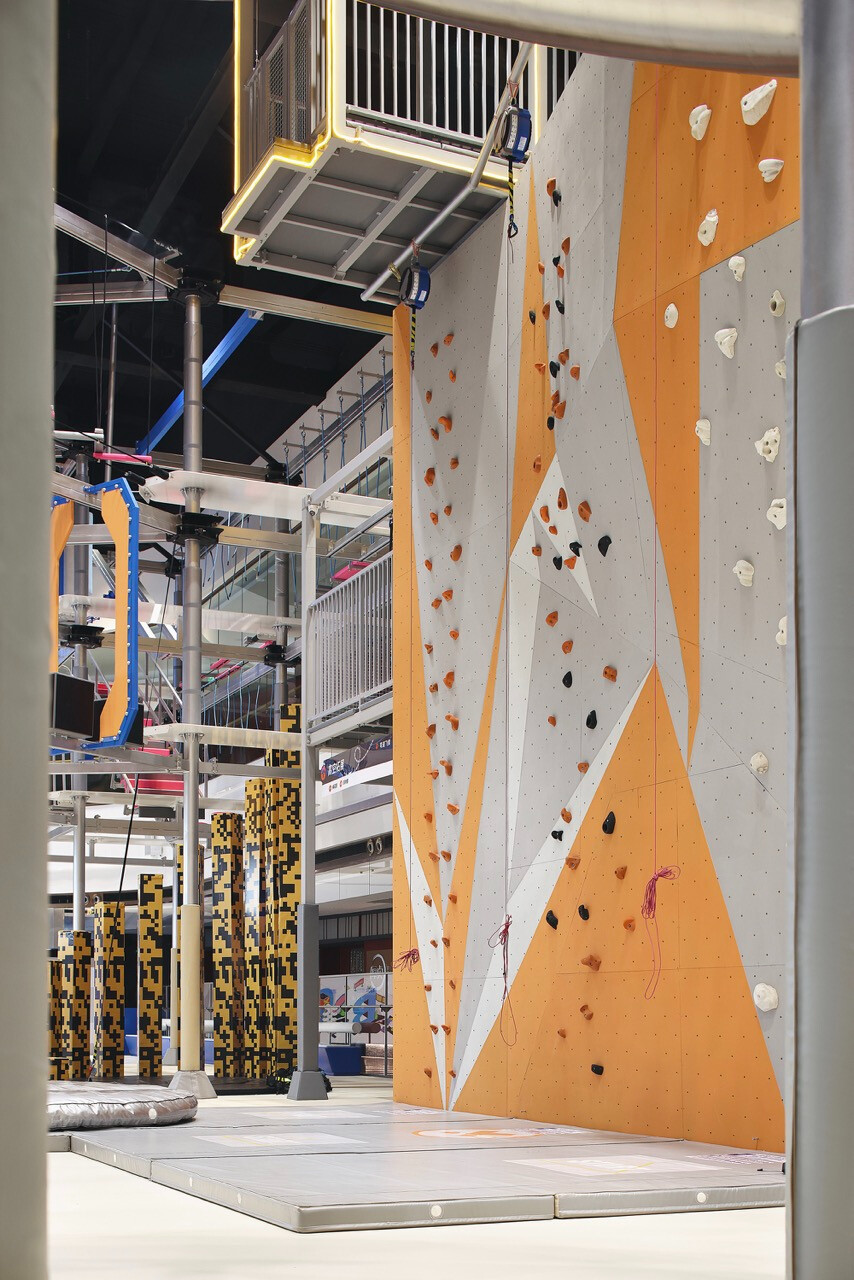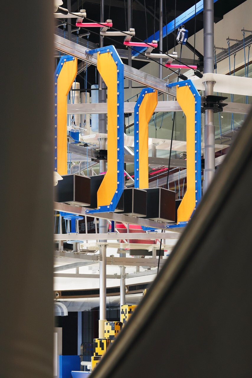 然而,對 Z 世代而言,價值不再只來自於擁有,而是來自於參與。XBOX 家庭運動中心正是基於這樣的世代洞察,將近三十項體驗型設施編織成一條連續的冒險路徑,讓刺激、探索與成就感層層堆疊。高達十一公尺的滑梯系統,以速度作為情緒的引爆點;而超過二十公尺的透明高空隧道,則讓身體懸浮於空中,視線俯瞰整個場域,形成立體而強烈的空間感知。這些設施不只是娛樂工具,更是空間節奏的轉折節點。高空拓展區以多重關卡構成,平衡、判斷、力量與耐力在不同關卡中被輪番測試。這種循序推進的設計,使參與者在無形中進入一種專注狀態,彷彿身處一場現實版的冒險遊戲。而披上像素語彙的梅花樁,則巧妙地喚醒集體記憶,讓童年遊戲的純粹快樂,在當代空間中重新被召喚。這種跨世代的情感連結,使場域不再只屬於某一個年齡層。